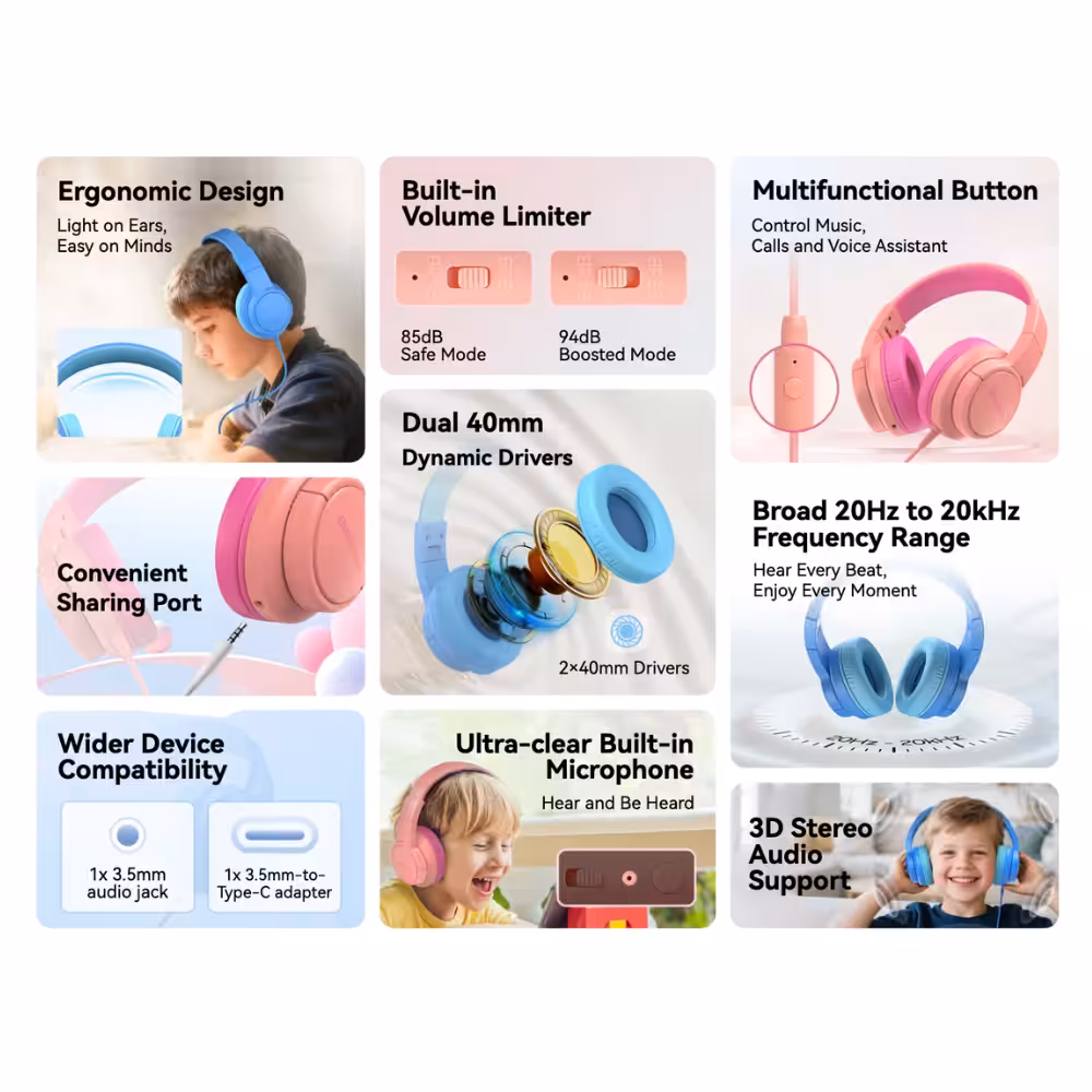 Die Blackview Fitbuds K1 sind kabelgebundene Kopfhörer, die speziell für Kinder entwickelt wurden. Sie bieten hohen Tragekomfort, robuste Materialien und einen ausgewogenen Klang für den täglichen Gebrauch. Das Gehäuse aus ABS + TPE sorgt für Flexibilität und Langlebigkeit, während das integrierte Mikrofon ideal für Online-Unterricht, Anrufe und Videochats ist. Das 1,6 m lange Kabel ermöglicht ausreichend Bewegungsfreiheit.