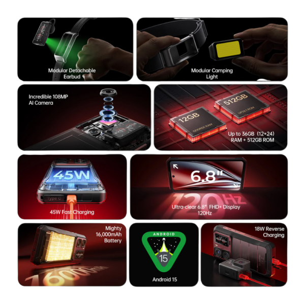 Sein riesiger 16.000-mAh-Akku und die 45-W-Schnellladefunktion bieten Autonomie für ganze Tage, und dank der Reverse-Ladefunktion kann es als Stromquelle für andere Geräte verwendet werden. Darüber hinaus verfügt es über ein abnehmbares Headset, das als Smartwatch fungiert, und eine modulare Taschenlampe mit drei Stufen – praktische Werkzeuge für den Einsatz im Freien und bei der Arbeit. Ein 6,8-Zoll-FHD+-Display mit 120 Hz, eine 108-MP-Hauptkamera und Android 15 runden das robuste und leistungsstarke Paket für den Außenbereich ab.